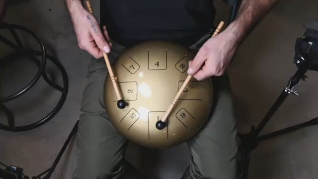 The notes are laid out on each of the drums so that you can create a most beautiful melody by starting at the bottom and alternating right and left hands as you go around the instrument. You can also play a beautiful tune by moving around the instrument in a circular manner.