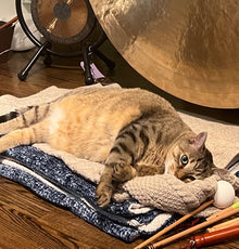 Are you feeling stressed? Theo, our 21lb Abyssinian cross, is a big cat with a big presence! You may encounter Theo’s unique meow. He’s one of two friendly cat therapists at the Sound Journey Store.